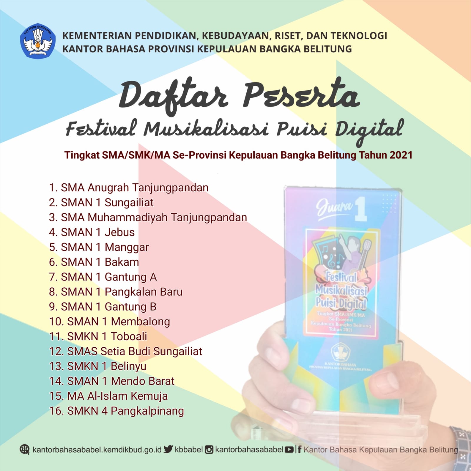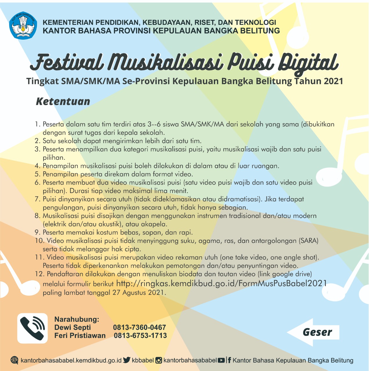 Pendaftaran peserta Festival Musikalisasi Puisi Digital bagi Siswa SMA/SMK/MA Tahun 2021 resmi ditutup pada tanggal 27 Agustus 2021. Sebanyak 16 tim dari 15 SMA/SMK/MA di Kepulauan Bangka Belitung mengikuti lomba pada tahun ini. Proses penjurian sedang dilakukan oleh dewan juri. Pengumuman pemenang akan diumumkan segera setelah proses penjurian selesai yang direncanakan pada tanggal 6 September…