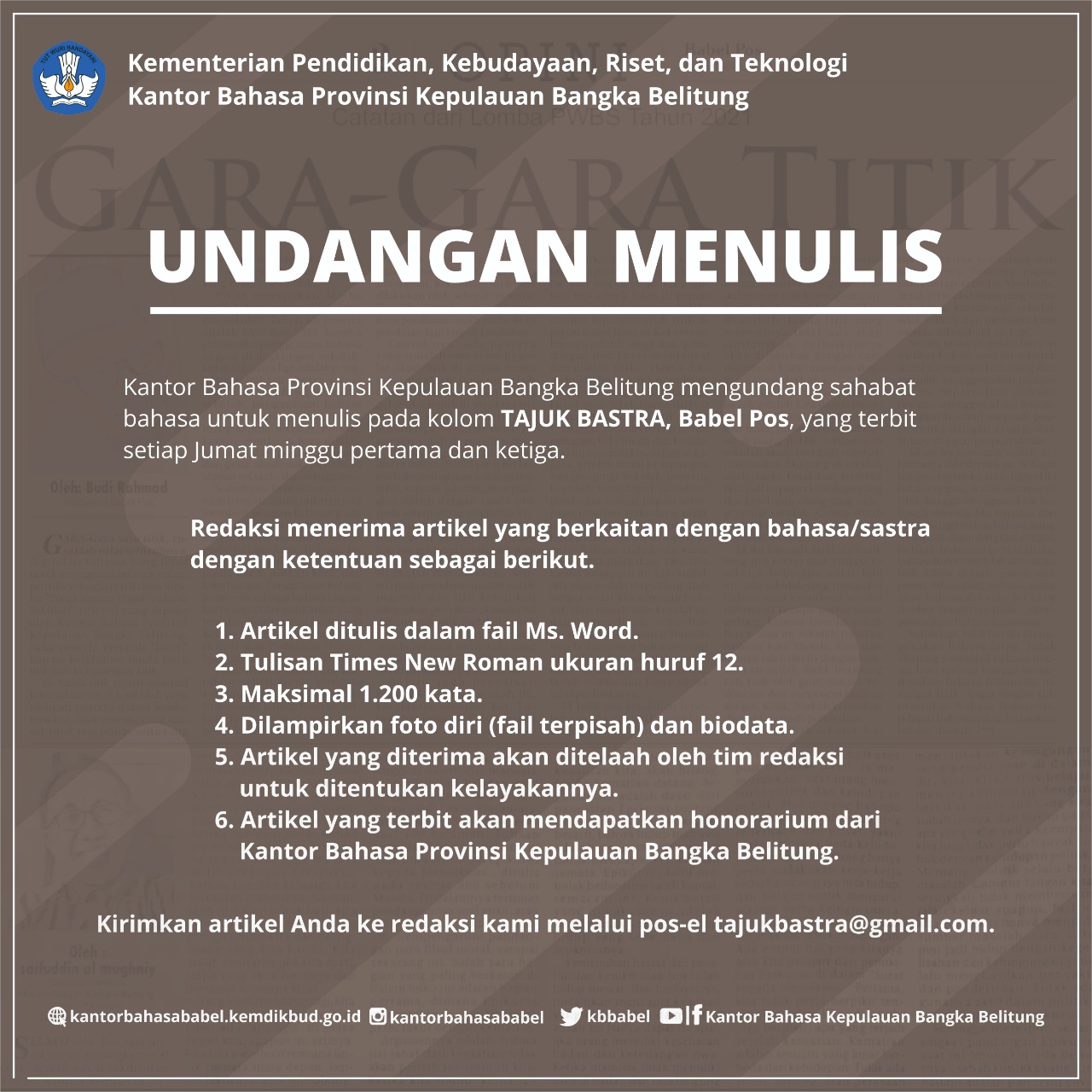 Kantor Bahasa Provinsi Kepulauan Bangka Belitung bekerja sama dengan Harian Babel Pos membuat kolom “Tajuk Bastra” yang terbit setiap Jumat minggu pertama dan ketiga. Untuk mengisi kolom tersebut Kantor Bahasa Provinsi Kepulauan Bangka Belitung mengundangan #SahabatBahasa untuk berpartisipasi mengirimkan tulisan terkait bahasa dan sastra. Naskah dapat dikirimkan ke redaksi Tajuk Bastra melalui posel: tajukbastra@gmail.com.