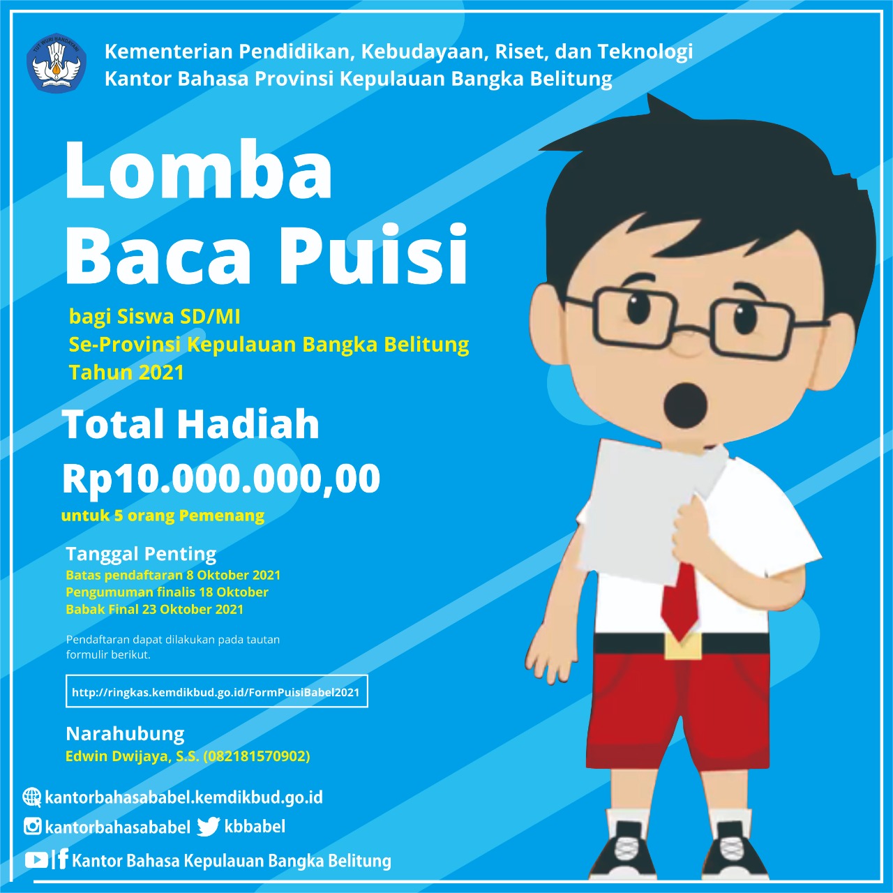 Dalam rangka memperingati bulan Bahasa dan Sastra, Kantor Bahasa Provinsi Kepulauan Bangka Belitung menyelenggarakan Lomba Baca Puisi bagi Siswa SD/MI di Provinsi Kepulauan Bangka Belitung. Di masa pandemi ini lomba dilaksanakan melalui seleksi video yang dikirimkan oleh peserta. Pendaftaran lomba dapat melalui tautan berikut ini. Keterangan lebih lanjut dapat dilihat pada poster berikut.