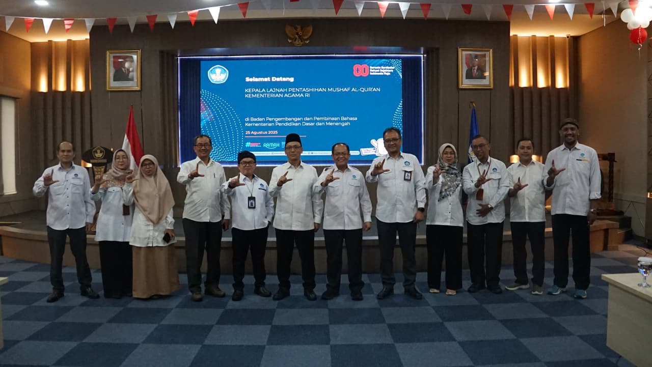 Jakarta, 29 Agustus 2025 – Lajnah Pentashihan Mushaf Al-Qur’an (LPMQ) Kementerian Agama melakukan audiensi dengan Badan Pengembangan dan Pembinaan Bahasa (Badan Bahasa), Kementerian Pendidikan Dasar dan Menengah (Kemendikdasmen) di Aula Sasadu, Kantor Badan Bahasa, Jakarta. Pertemuan ini menjadi langkah awal dalam memperkuat sinergi antara dua lembaga negara yang memiliki mandat berbeda, tetapi saling terkait erat, yaitu dalam pemeliharaan mutu teks terjemahan dan tafsir kitab suci Al-Qur’an yang sesuai dengan kaidah bahasa Indonesia.