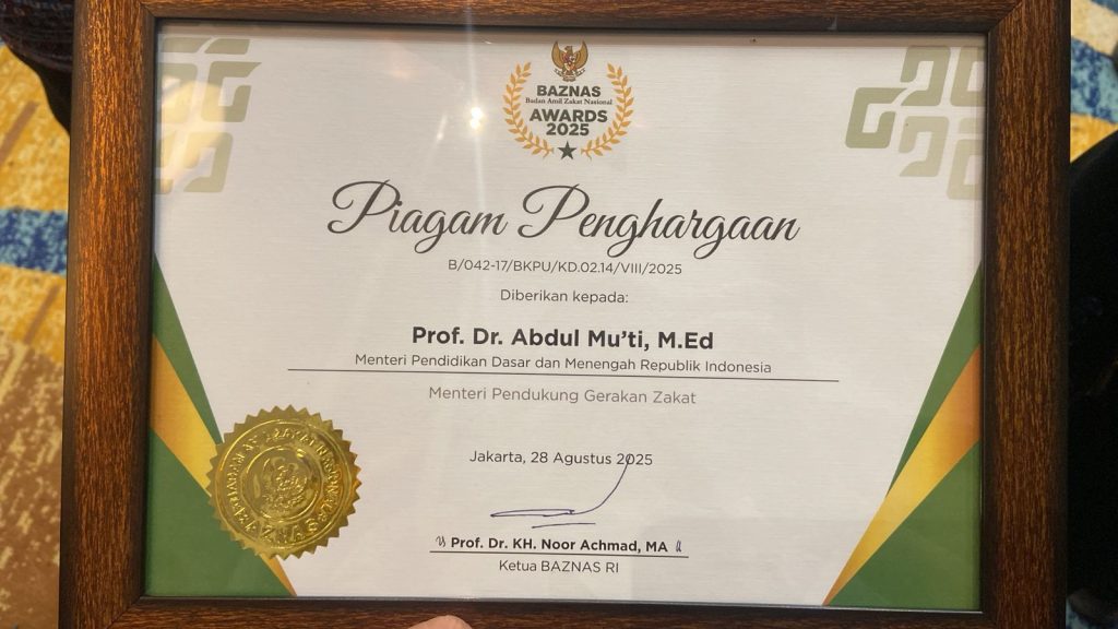 Jakarta, 29 Agustus 2025 – Menteri Pendidikan Dasar dan Menengah (Mendikdasmen), Abdul Mu’ti, menerima penghargaan spesial “Menteri Pendukung Gerakan Zakat” yang diberikan oleh Badan Amil Zakat Nasional (BAZNAS) dalam acara Penganugerahan BAZNAS Awards 2025 di Jakarta, Kamis (28/8).