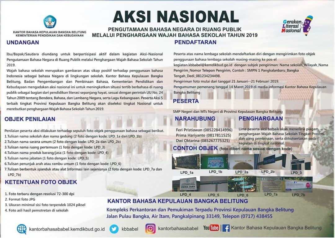 Kantor Bahasa Kepulauan Bangka Belitung melaksanakan Aksi Nasional Pengutamaan Bahasa Negara melalui Penghargaan Wajah Bahasa Sekolah Tahun 2019. Kegiatan ini merupakan program nasional yang dilaksanakan di seluruh provinsi. Khusus saat ini sesuai dengan petunjuk teknis pelaksanaan kegiatan hanya dikhususkan untuk SMP Negeri dan MTs Negeri. .Ayo ikuti dan jadikan sekolahmu cerminan sekolah tertib berbahasa. Unduh…